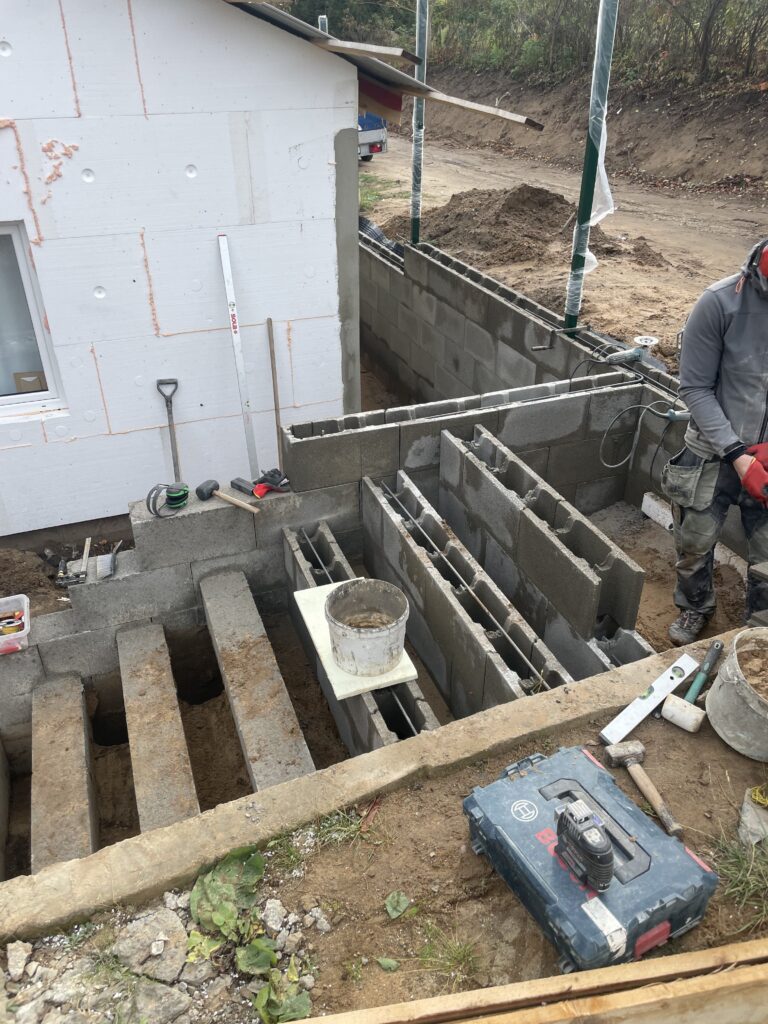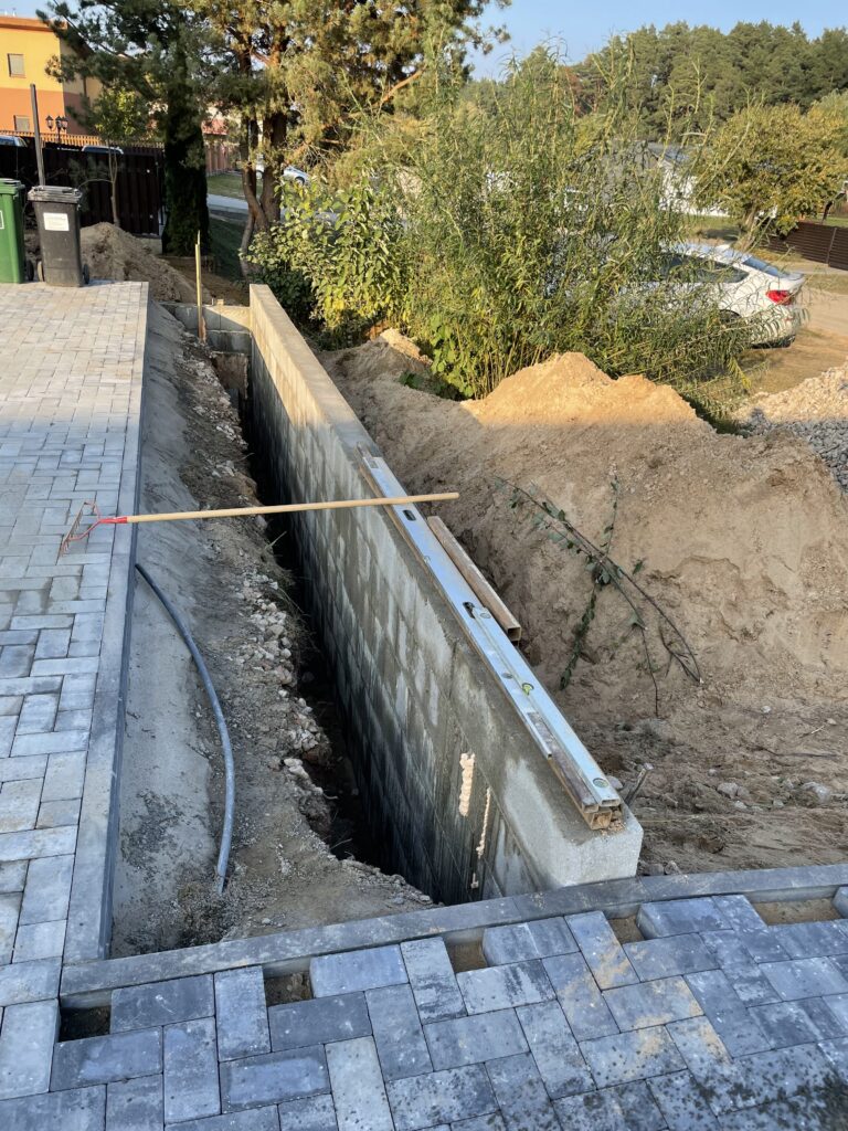Mūsų komanda atraminių sienelių statybai naudoja užpilamus pamatinius betoninius blokelius. Tai yra greitas ir mažiau investicijų reikalaujantis būdas.